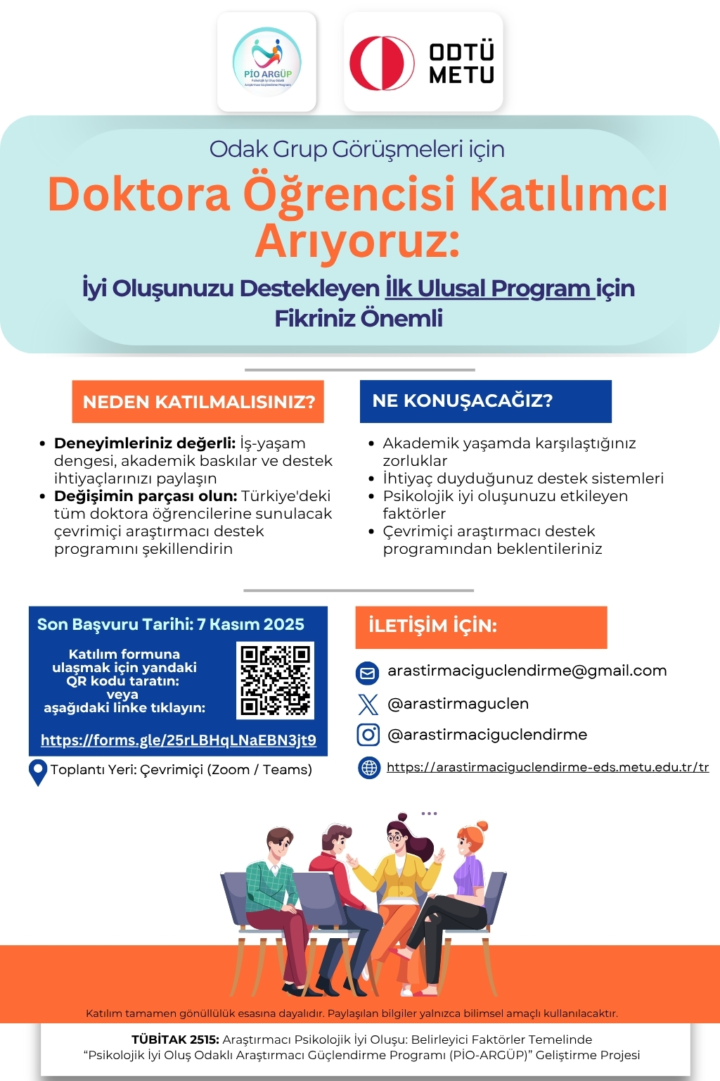 Psikolojik İyi Oluş Odaklı Araştırmacı Güçlendirme Programı'mızın ihtiyaç analizi aşamasında, odak grup görüşmeleri için doktora öğrencileri arıyoruz. Bakış açınız, doktora öğrencilerinin iyi oluşunu önceleyen ulusal, araştırma temelli bir destek programının tasarımını doğrudan şekillendirecek. Bu çevrimiçi oturumda akademik yaşamdan getirdiğiniz yaşanmış deneyimleri, karşılaştığınız baskıları, ihtiyaç duyduğunuz desteği ve gerçekten işe yarayan uygulamaları paylaşacaksınız. Amacımız, gerçek doktora deneyimine dayanan kullanışlı ve ölçeklenebilir bir program inşa etmek.